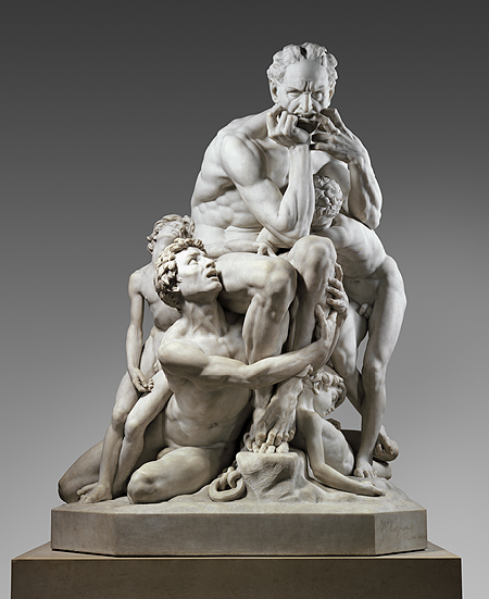 Yup, that’s Ugolino gnawing on his own hands and his grandsons offering up their own flesh instead. The great French sculptor Jean-Baptiste Carpeaux captured the agony in his momentous Ugolino and His Sons, the original marble version of which is in the Met Museum: